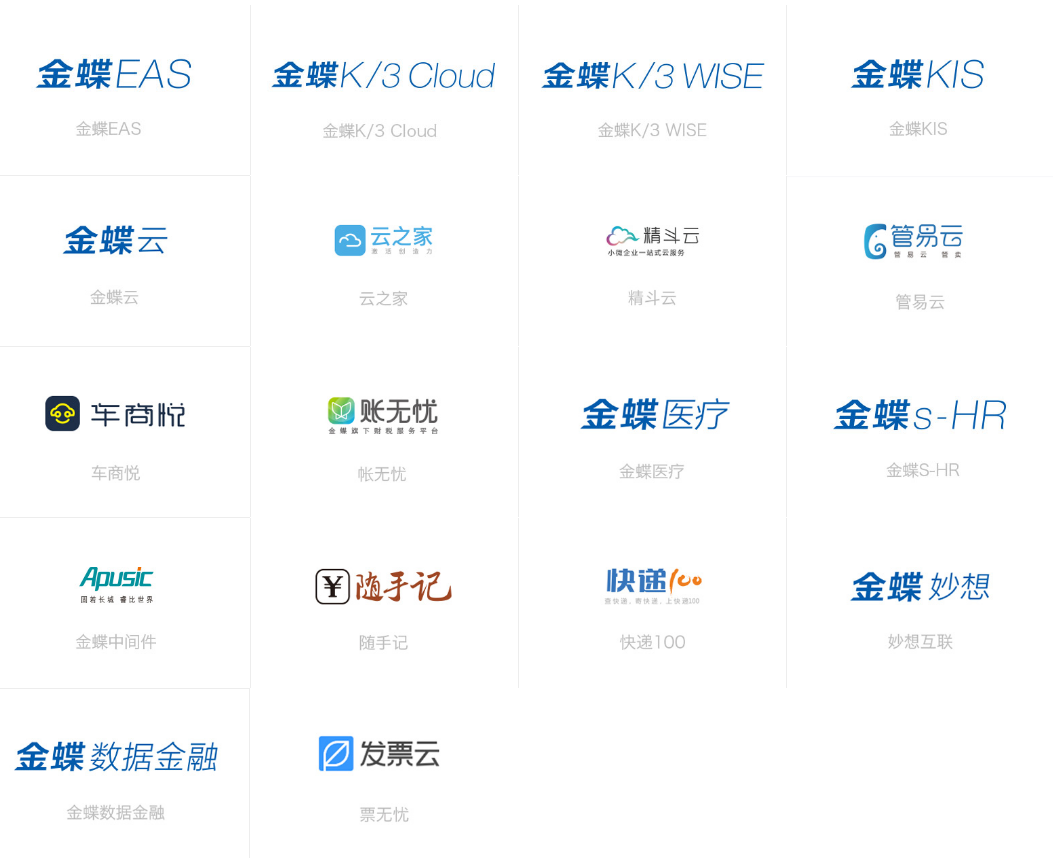 金蝶集團 | 金蝶云 | 云之家 | 精斗云 | 管易云 | 車商悅 | 賬無憂 | 智慧記 | 快遞100 | 我家云 | 金蝶醫(yī)療 | 金蝶天燕 | 金蝶互聯(lián)網(wǎng)金融